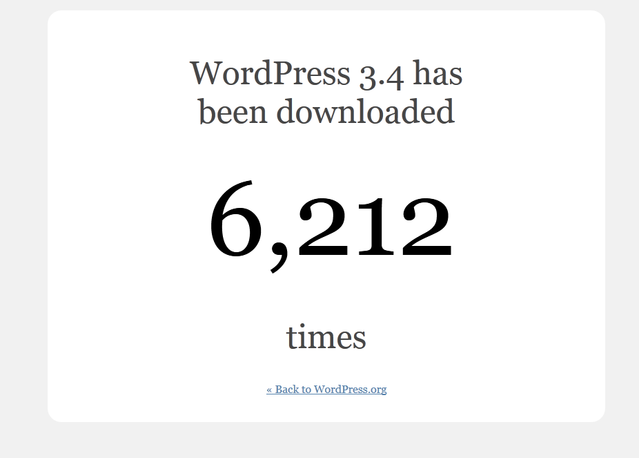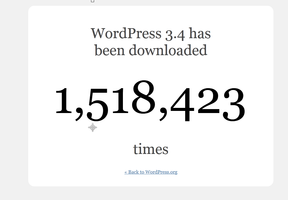WooHoo I won WordPress 3.4 dropped day after last show on June 13 damn I guess I can still guess the week if not the day. Was sure a quick trip from RC# to release. Wanting to see how fast it would download I went to get a screenshot of counter when I loaded the page it showed 5090 at 12:05pm PST and in the 1 min it took for my screen capture program to load it went to 6593 My bet is 13 million by podcast recording time –second shot on day of podcast a week later.